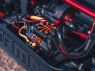 Durability •Extra-rigid, laser-etched anodised aluminium chassis •Multi-structured center brace system •Rear lower chassis brace •Strong composite chassis side pods •Under-chassis skids •Metal inserts molded into the front steering knuckles •Metal wishbone covers to prevent the pivot ball from pulling out of the arms •Extra-thick molded composite front and rear shock towers •Heavy-duty drivetrain •Durable steel driveshafts •All-metal diff outdrives and gearbox internals •Spiral-cut crown/pinion gears •Metal differential gears •Metal spur/idler gear •Aluminium sliding motor mount •Heavy-duty dual spring servo saver •Waterproof* receiver box •Electronic ESC power switch •Captured hinge pins •Aluminium hanger inserts •Center protection tower that interfaces with the roll cage for increased body durability •Body clip protection pads on top of body •Single piece wing mount •Heavy-duty front bumper •Metal 24mm hex inserts in wheels Easy Maintenance •Easy access to front and rear differentials (5 screws) •Easy-to-remove Power Module (5 screws) •Sliding motor mount for easy motor removal (3 screws) •Easy-to-remove chassis braces (1 clip with retainer) •Easy-to-remove front, rear and center modules •Easy-access waterproof* electronics module